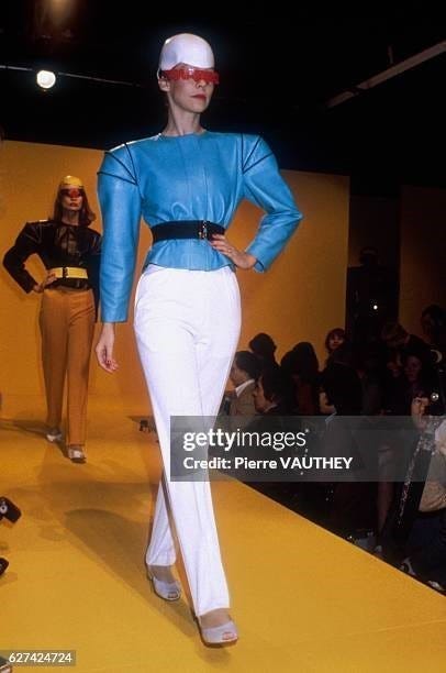 Serving as a timestamp that encapsulates the spirit of an era, fashion becomes one of its most memorable symbols, immortalized through media and art. In the 1980s, in reaction to widespread economic optimism, clothing became a way to showcase wealth and success, resulting in the era's opulent and dramatic styles. The 80’s are defined by bold colors, exaggerated silhouettes, and power driven styles, emblematic of capitalist excess and individualism. An example can be seen in Pierre Cardin’s 1980 Spring-Summer show, where he designed a bright blue haute couture shirt that accentuated the model’s shoulders with shoulder pads and paired it with white slacks. In alignment with capitalist ideals, the large structured shoulders and clean lines symbolized individuals' desire to take up space and assert dominance within their professional and social hierarchies.
