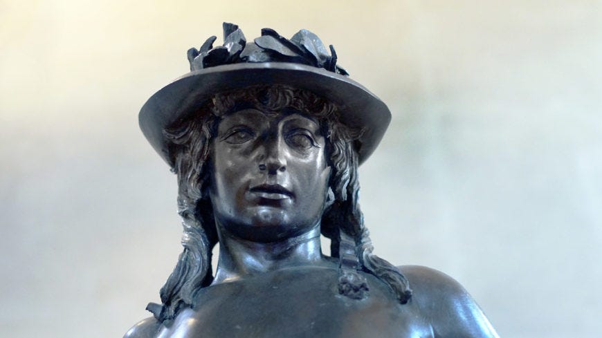 It was in my high school art history class when I first saw the slightly grainy, cheap projector quality photos of Donatello’s ”David.” The innumerable divergences between these two beautiful interpretations stunned me; if you were to place both of these pubescent teenagers next to each other, Donatello’s “David” wouldn’t even reach the height of the pedestal Michelangelo’s is fixed on. Each detail of Donatello’s “David” pointed to the fact that the unlikely hero was, very clearly, unlikely. I have always been drawn to how markedly Donatello underscores David’s age, making him a symbol for average people with a heart full of irrational morality, a group I have often identified with.